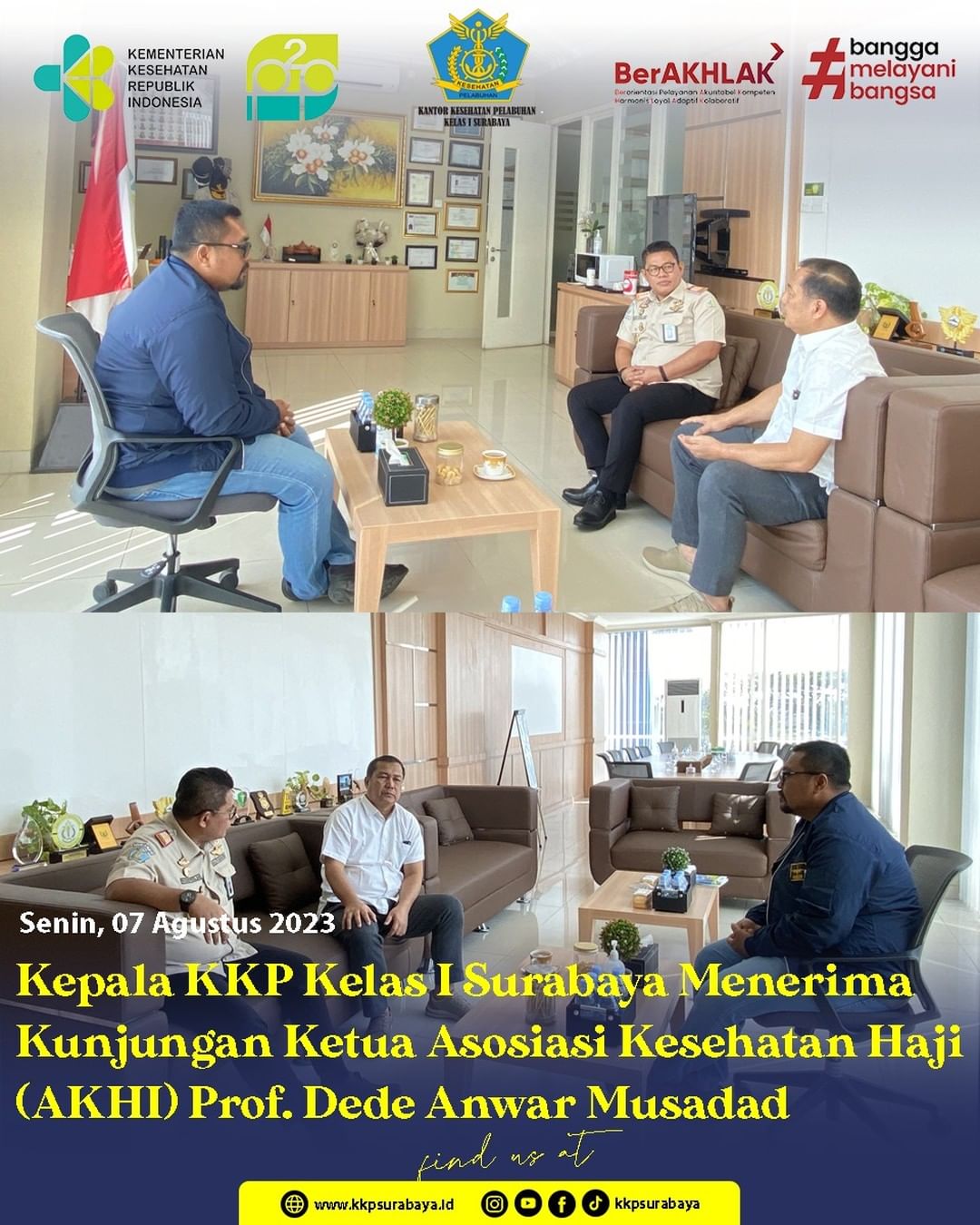 Sidoarjo (7/08)- Kepala Kantor Kesehatan Pelabuhan Kelas I Surabaya Dr. Rosidi Roslan, SKM, SH, MPH, MH menerima kunjungan Ketua Umum Asosiasi Kesehatan Haji Indonesia (AKHI) Prof. Dede Anwar Musadad, SKM, M.Kes. dalam rangka berdiskusi terkait kesehatan jamaah haji Embarkasi Surabaya 1444H/2023.
