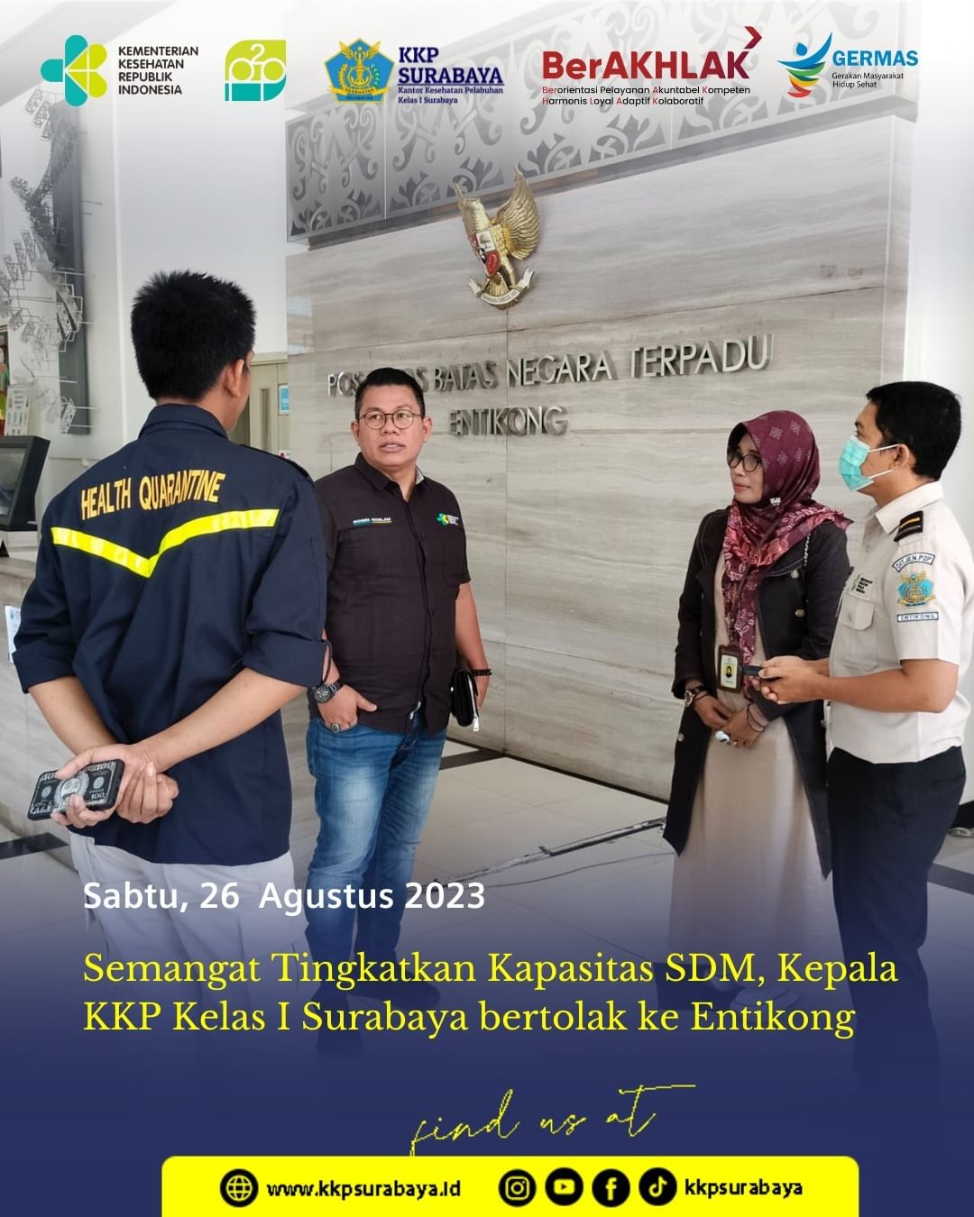 Entikong – Setelah menghadiri undangan sebagai pembicara di KKP kelas II Pontianak, Kepala KKP Kelas I Surabaya, Dr. Rosidi Roslan, SKM, SH, MPH, MH melanjutkan perjalan ke KKP Entikong dengan agenda yang sama. Kali ini Dr. Rosidi berbicara terkait peningkatan kapasitas SDM di KKP Entikong dalam pengawasan kekarantinaan kesehatan di pos lintas batas darat negara (26/8). Kedatangan beliau, disambut antusias oleh SDM disana yang sedang bertugas.